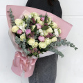 Букет из розовых пионов и лавандовой маттиолы в упаковке