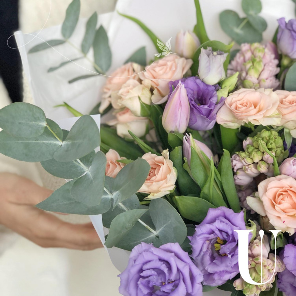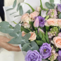 Нежная композиция из роз, диантуса и маттиолы в упаковке