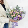 Букет из нежно-розовых пионовидных кустовых роз и белой эустомы в упаковке