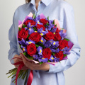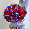 Композиция из роз сорта Талея, диантуса, альстромерий и других цветов в дизайнерской упаковке