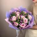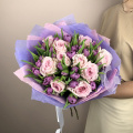 Букет из роз Пинк Охара, роз Аква и белых эустом в упаковке