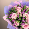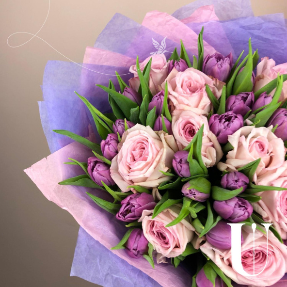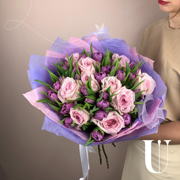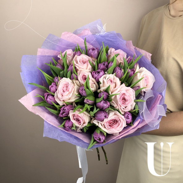 Сочетание тюльпанов с пионовидной розой непременно порадует получателя своей невероятной красотой и ароматом