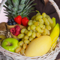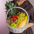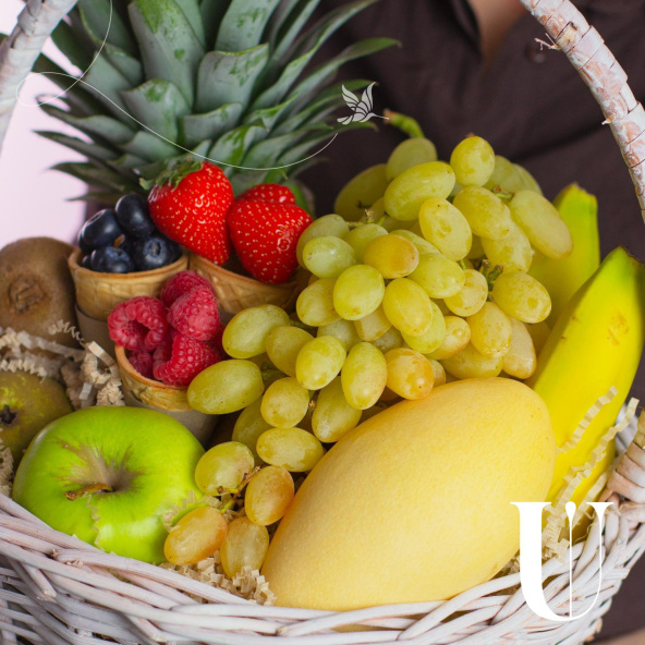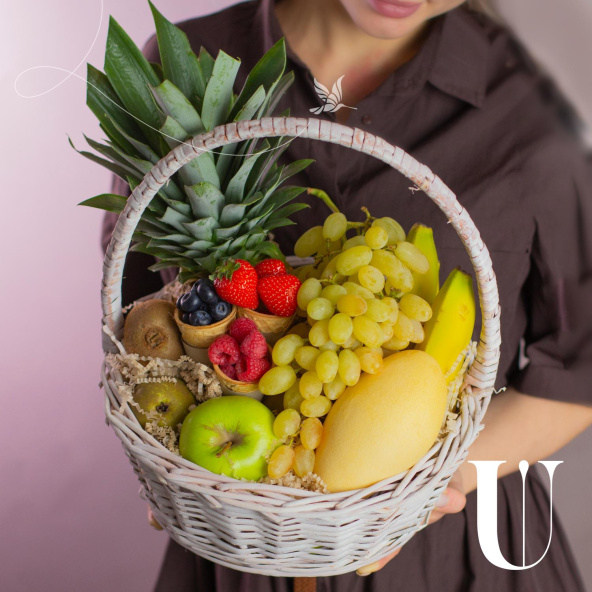 Состав: ананас 1 шт, банан 6 шт. киви 2 шт, груша конференц 2 шт, яблоко зеленой 1 шт, манго желтое 1 шт, виноград зеленый 0,5 кг ветка, вафельный рожок Клубника 70 гр, вафельный рожок голубика 80 гр, вафельный рожок малина 80 гр., наполнитель.