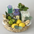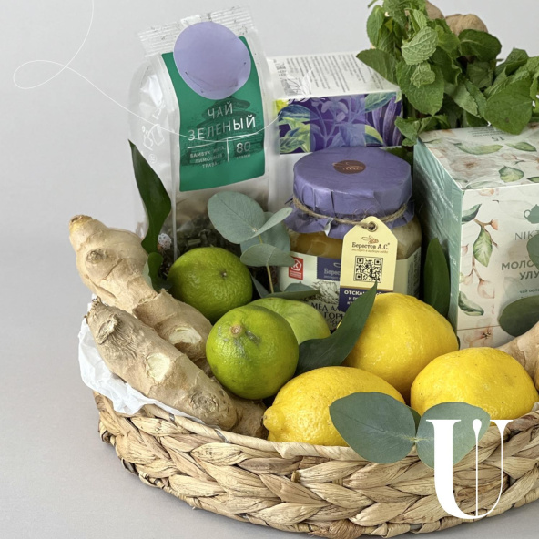 Яркая композиция в плетеной низкой корзине с различным чаем, горным мёдом и мятой. Чайную симфонию успешно дополняют зеленые яблоки, лимоны и имбирь.