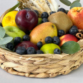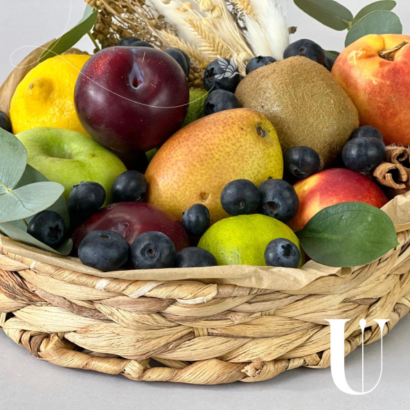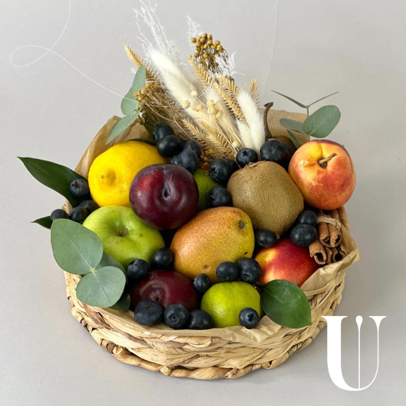Корзина всех наших любимых фруктов - груши, яблоки, киви и нектарины составляют яркую композицию, притягивающую взгляд и пробуждающую аппетит. Разбавляет это изобилие сочная голубика и веточки зеленого эвкалипта.