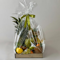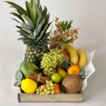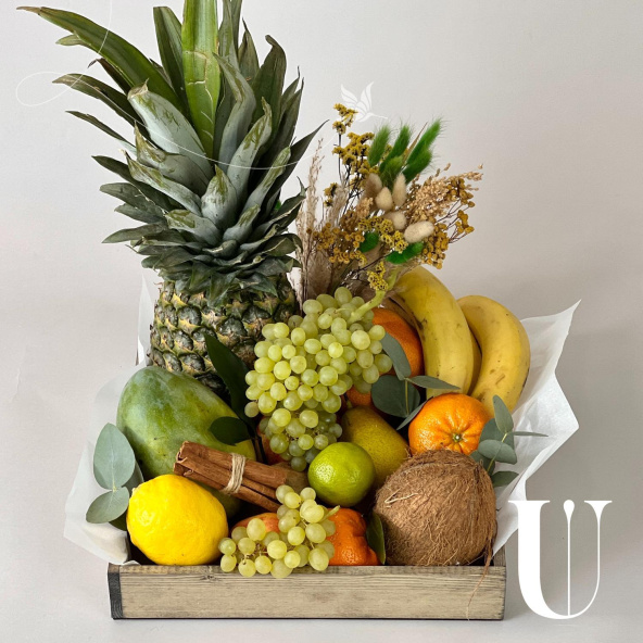 Большой ящик свежих тропических фруктов, украшенный эвкалиптом и сухоцветами, станет достойным подарком руководителю, другу или любимому человеку.