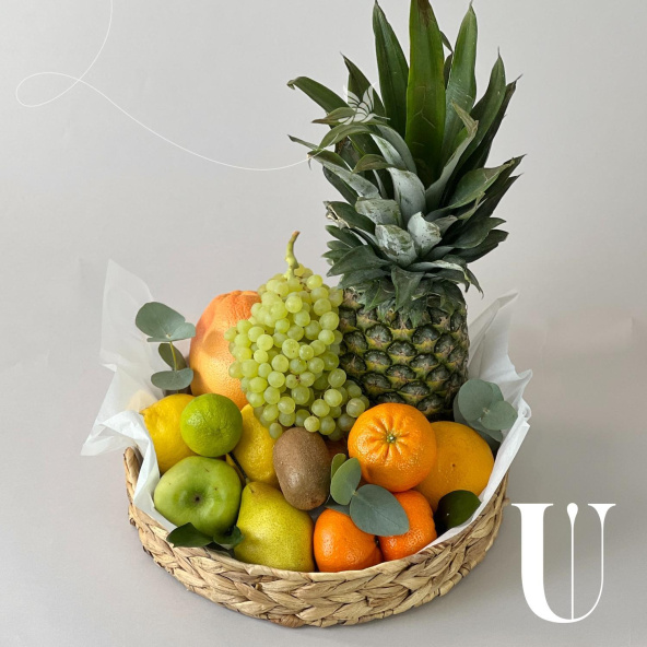 Ароматный фруктовый микс в низкой плетеной корзине. Отличный подарок на любой праздник!