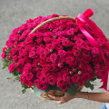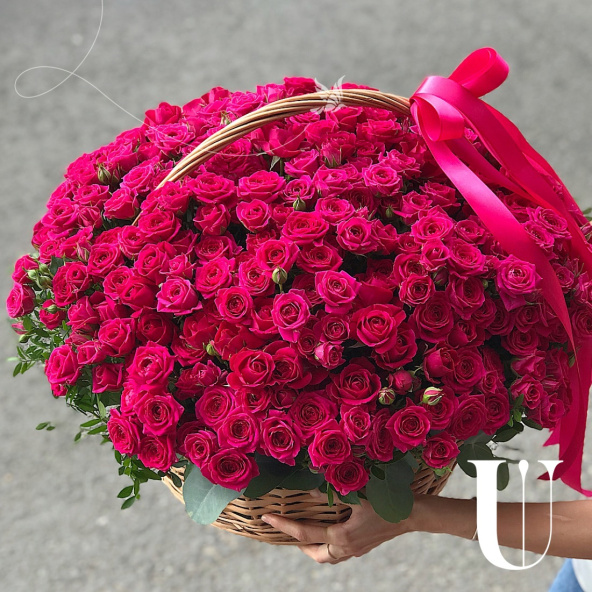 50 кустовых розочек малинового цвета в корзине перевязанный лентой