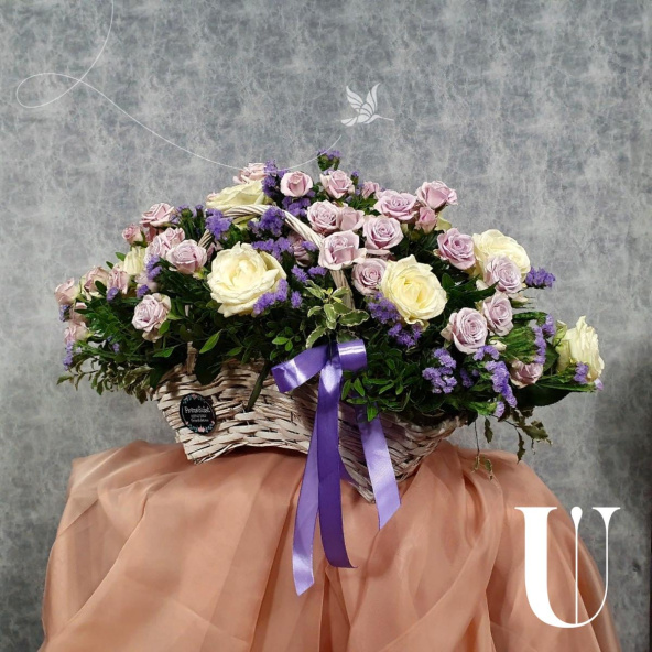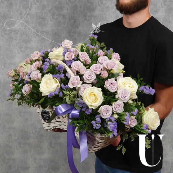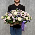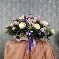 Композиция из роз Миритим, белых кустовых хризантем и фиолетового диантуса в корзине