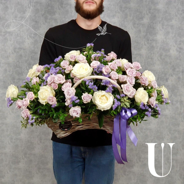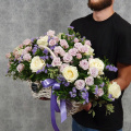 Композиция из роз Миритим, кустовой пионовидной розы Джульетта и белых кустовых хризантем в корзине