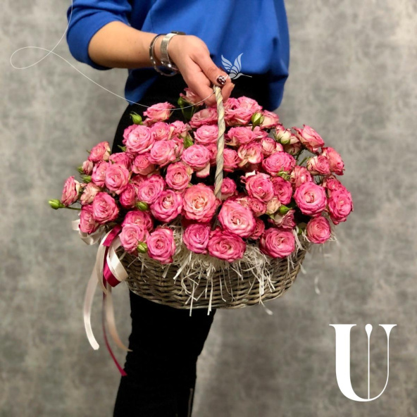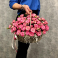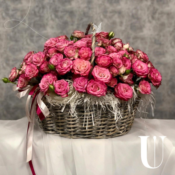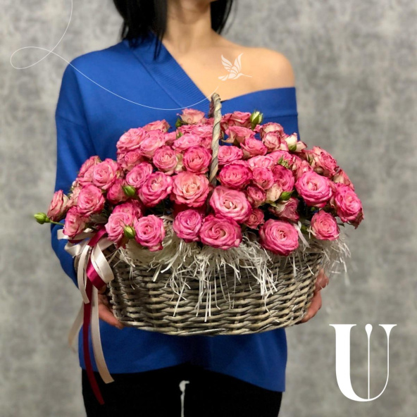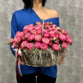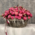 Композиция из роз Миритим, кустовой пионовидной розы Джульетта и белых кустовых хризантем в корзине