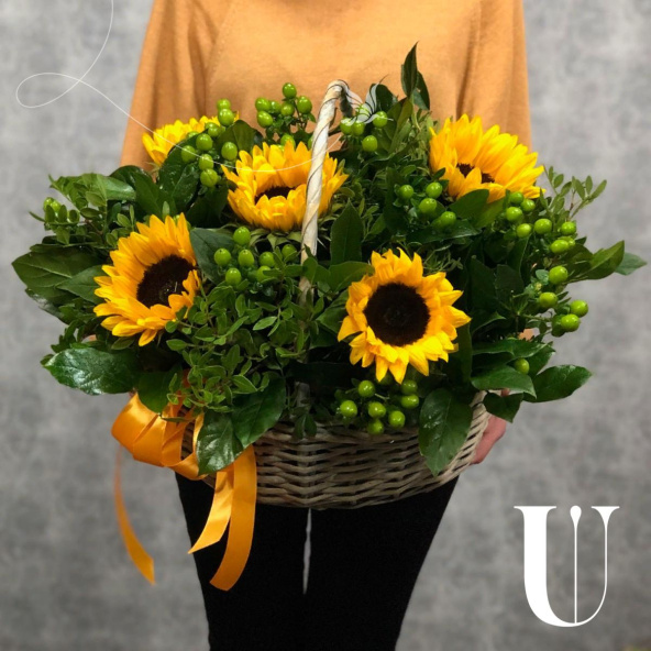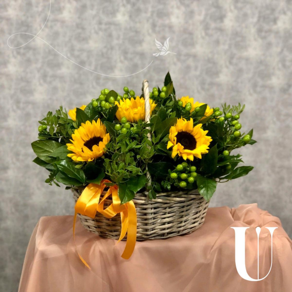 Композиция из белых диантусов, розовой эустомы и белой розы в корзине