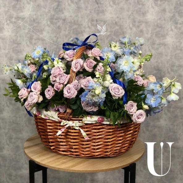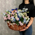 Кустовые хризантемы, синие ирисы, лавандовые маттиолы и другие цветы в корзине