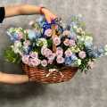 Альстромерии, диантусы, сантини и кустовые розы в корзине