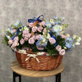 Цветочная композиция из роз Пинк Мондиаль, фиолетовых гортензий, сиреневых кустовых роз и белых альстромерий в корзине