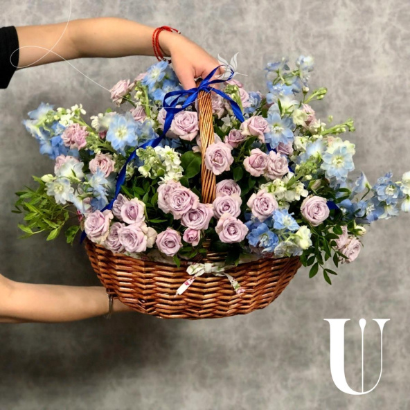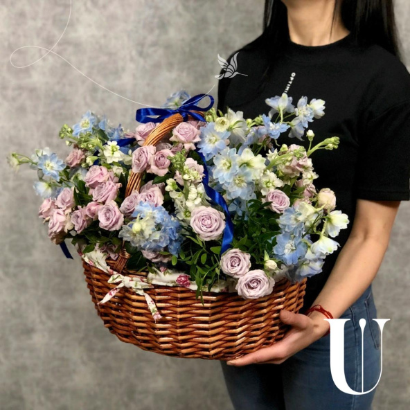 Лилия, розы, диантус, эустома и другие цветы в корзине