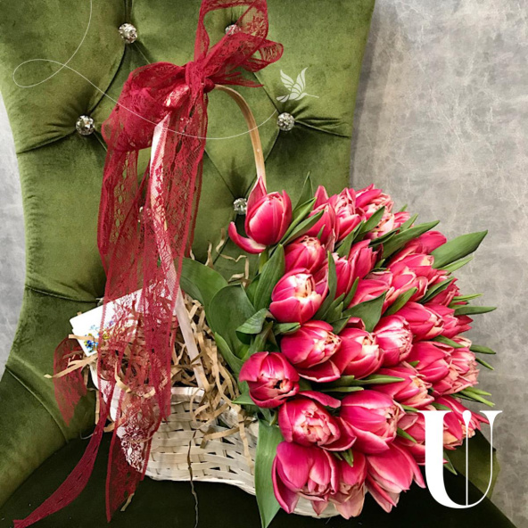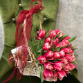 Цветочная композиция из роз Карина, пиона Корал Шарм и диантусов Барбатус в красной сумочке