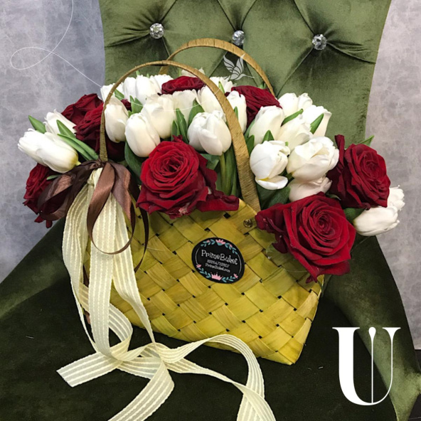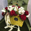 Композиция из роз Ред Наоми и белых эустом в красной сумке