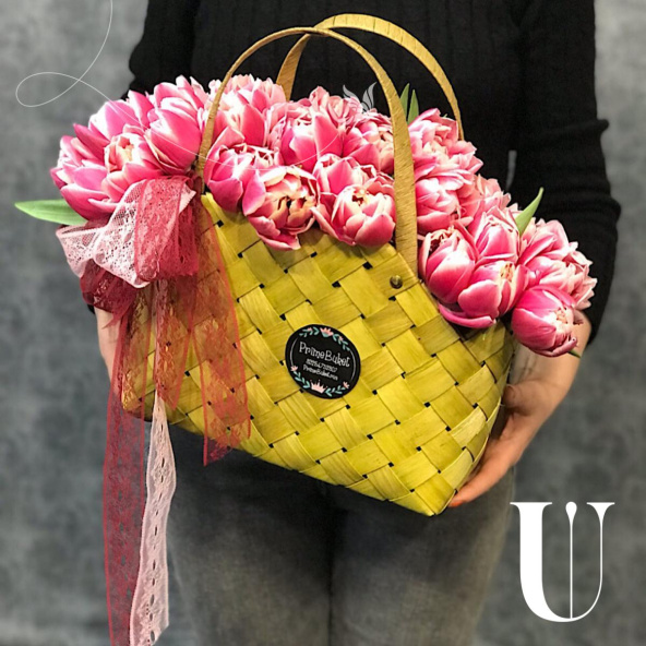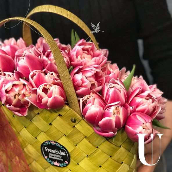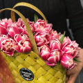 Композиция из роз Миритим, кустовой пионовидной розы Джульетта и белых кустовых хризантем в корзине