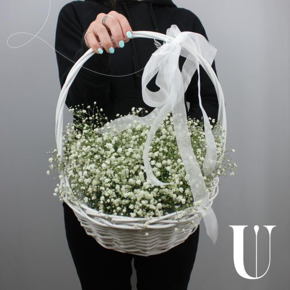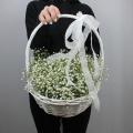 Композиция из белых кустовых хризантем, кустовой пионовидной розы Джульетта и кустовой розы Лидия в белой корзине