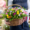 Лилия, розы, диантус, эустома и другие цветы в корзине
