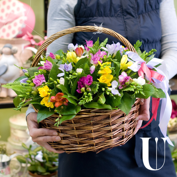 Яркая композиция из желтых тюльпанов, синих ирисов и белых эустом в корзине