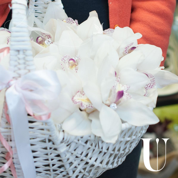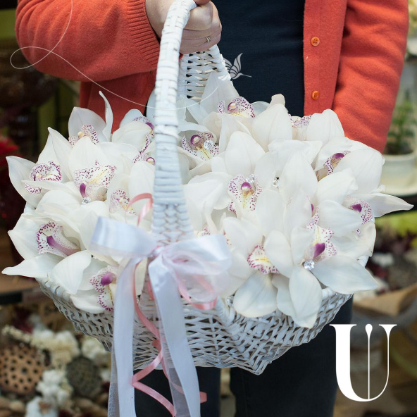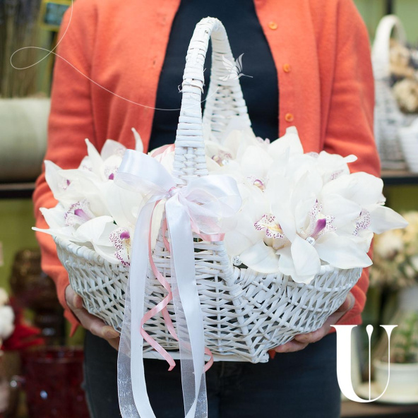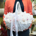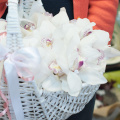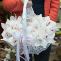 Композиция из фиолетовых корзин, белых орхидей и фиолетовых диантусов в белой корзине