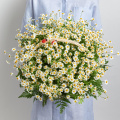 Композиция из фиолетовых диантусов, кустовых пионовидных роз Мисти Бабблз и белых кустовых хризантем в корзине