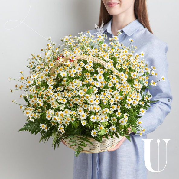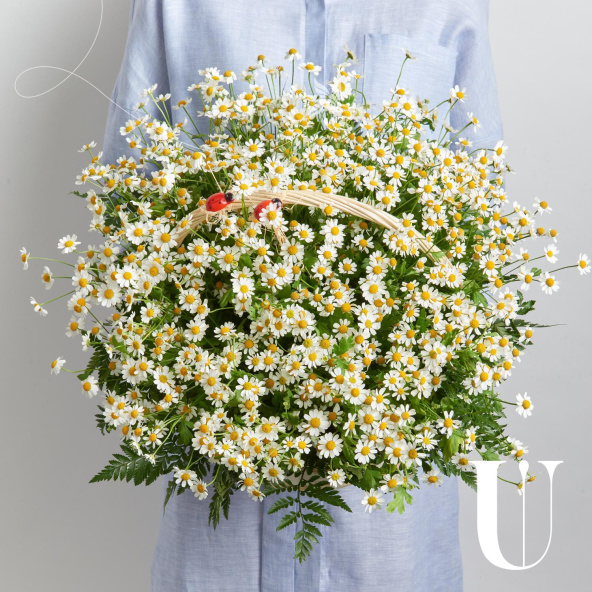 Стильная композиция из белых роз, кремовых диантусов и розовых маттиол в корзине