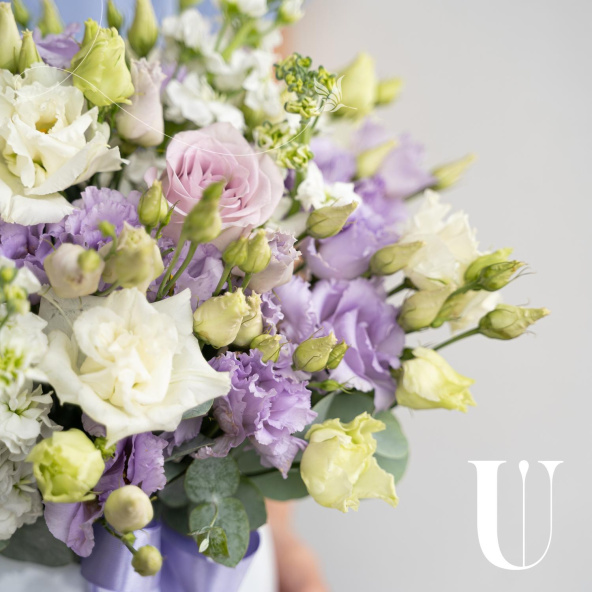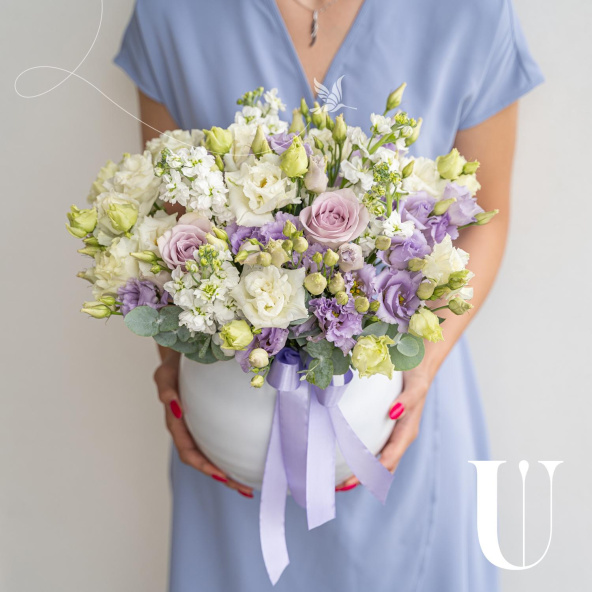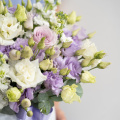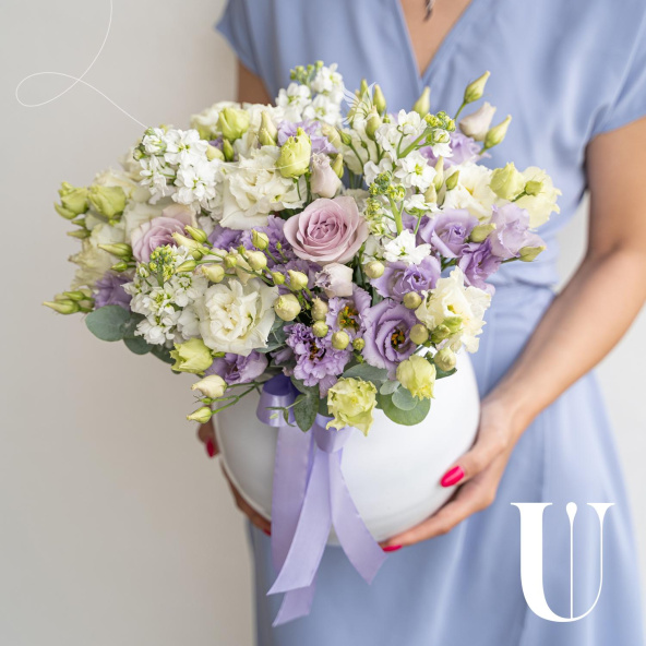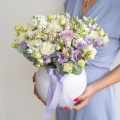 Композиция из розовых пионов, роз Аваланж и белых лизиантусов в белой корзине