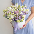Композиция в розово-сиреневых тонах из гвоздик, альстромерий, хризантем и других цветов в корзине