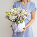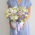 Композиция из диантусов Мун Аква, роз Свит Аваланж и сиреневых сантини в белой корзине