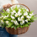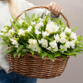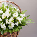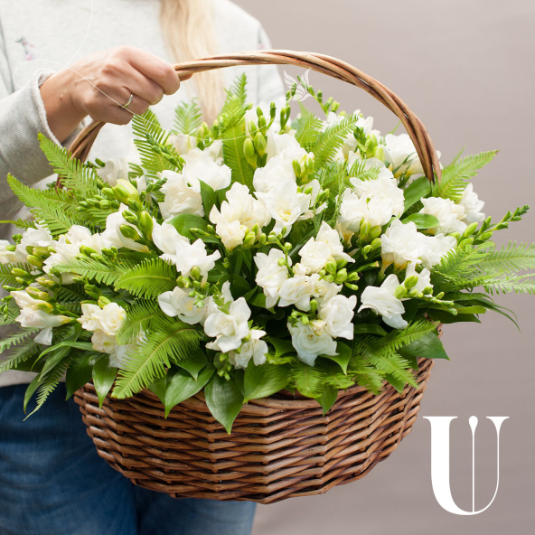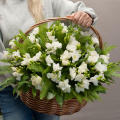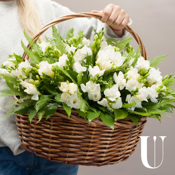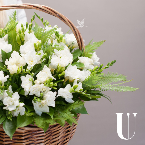 Композиция в белой гамме из кустовых роз, белых фрезий и белых альстромерий в корзине