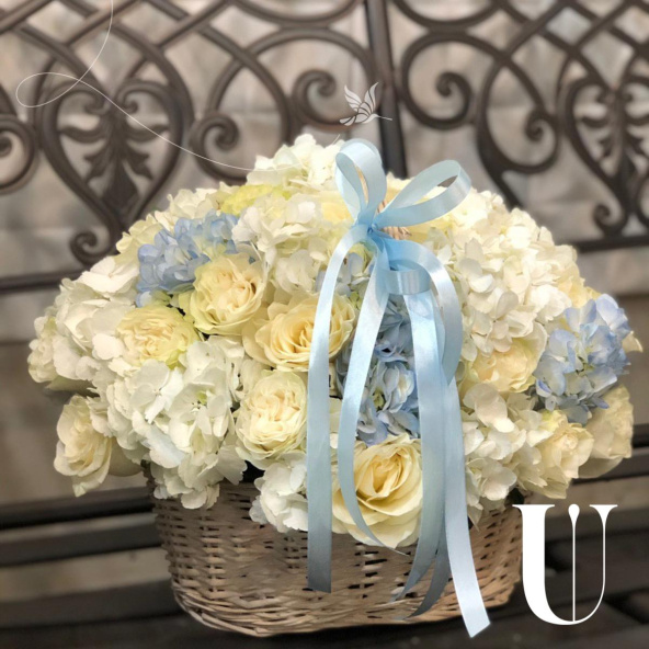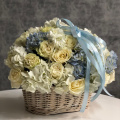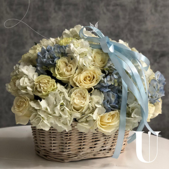 Изысканное сочетание соцветий голубых гортензий, розовых диантусов и кремовых кустовых роз в корзине
