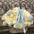 Композиция из кустовых пионовидных роз Джульетта, белых гортензий и белых диантусов в плетенной корзине