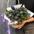 Кустовые хризантемы, синие ирисы, лавандовые маттиолы и другие цветы в корзине