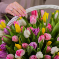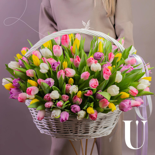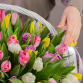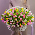 Огромная корзина из розовых гортензий, кустовых пионовидных роз Джульетта и фиолетовых диантусов