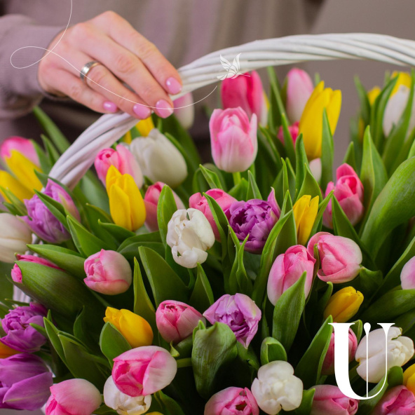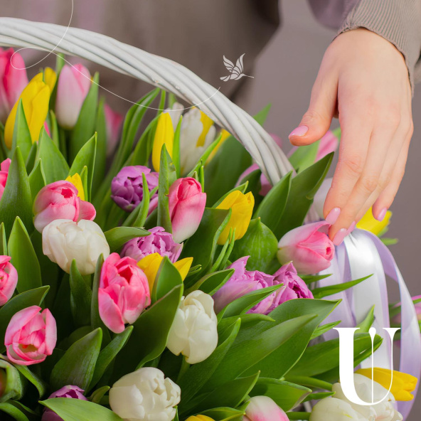 Композиция из белых орхидей, роз Вайт Охара и кремовых диантусов в плетенной корзине
