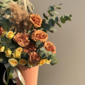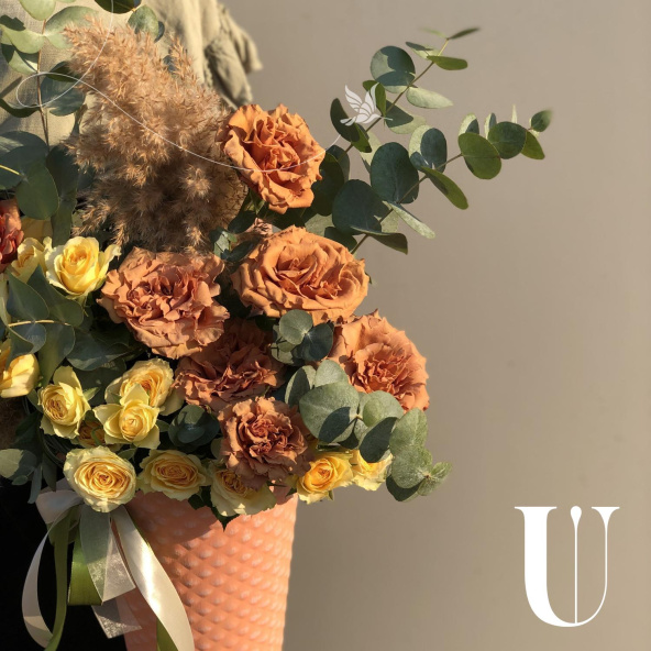 Композиция из роз Кантри Блюз и розовых эустом в сумке