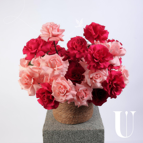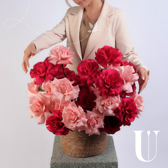 Композиция из роз сортов Нина и Фридом в плетеном кашпо