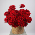 Композиция из роз сорта Ангажемент и малиновых роз в кашпо