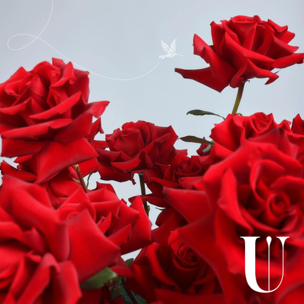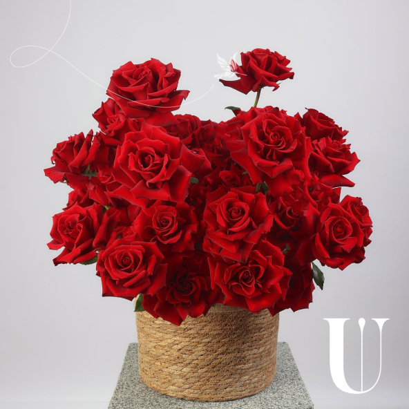 Композиция из 55 роз сорта Ангажемент в плетеном кашпо