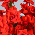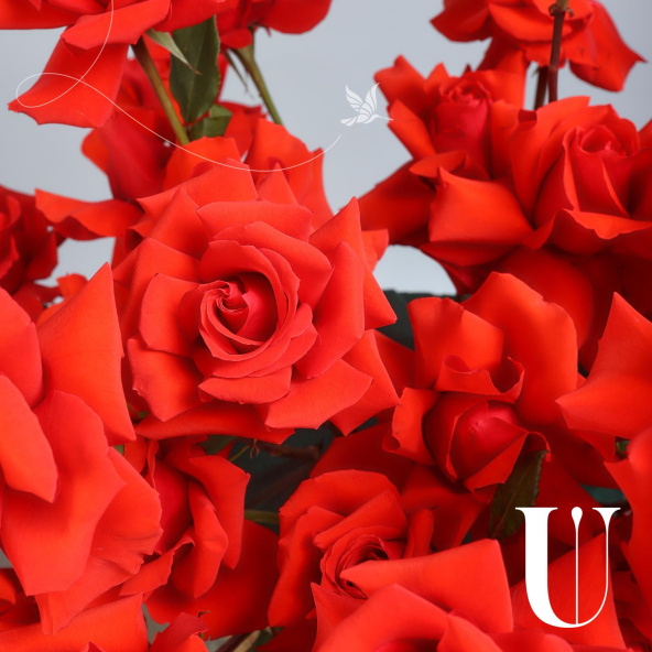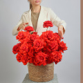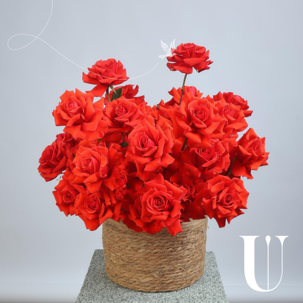 Букет из 55 красных вывернутых роз в плетеном кашпо