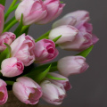 Большая композиция из роз Шангри Ла, розовых маттиол и фиолетовых эустом в корзине