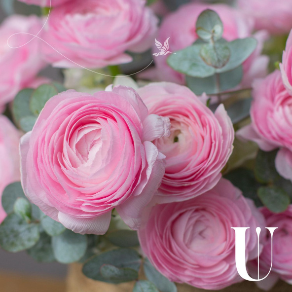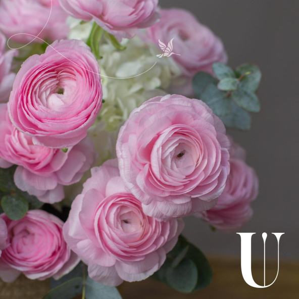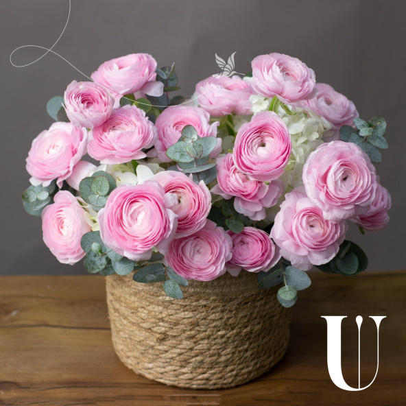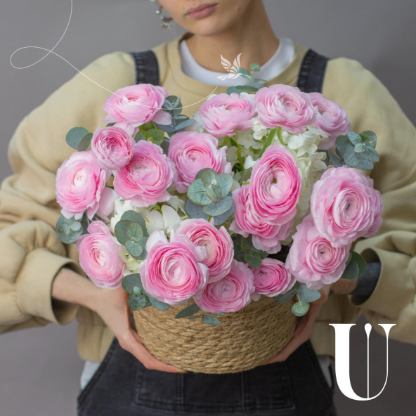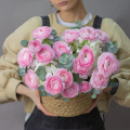 Композиция из кустовых пионовидных роз Мисти Бабблз в корзине