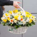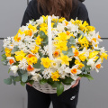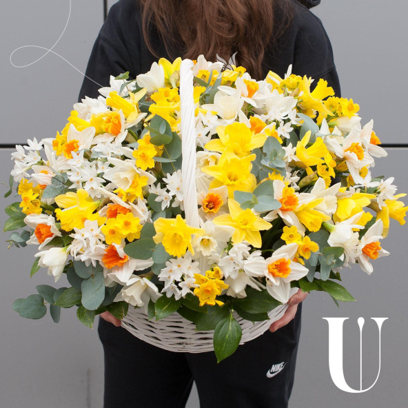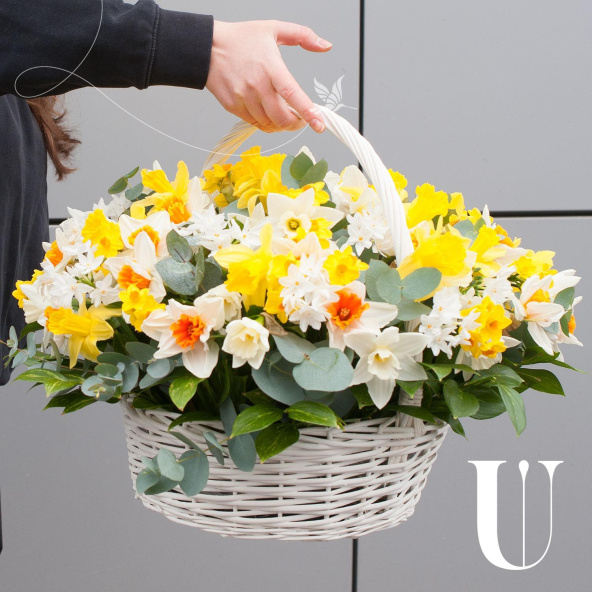 Цветочная композиция выполнена в виде корзины, что придает ей особый шарм и элегантность. Корзина с нарциссами станет отличным подарком для любого человека, будь то бабушка, деловой партнер, любимая, мама, коллега или ребенок.