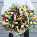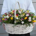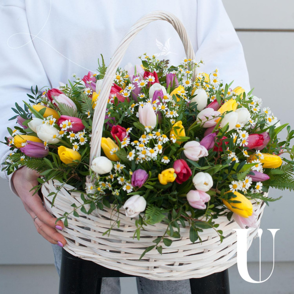 Корзина из весенних цветов "Тюльпаны с ромашками" - это уникальное сочетание красоты и свежести.