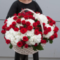Выбирая корзину из ярких красных роз и белой гортензии "Viva la Vita", вы делаете прекрасный и значимый подарок, который будет радовать получателя своей красотой и свежестью.