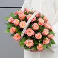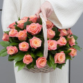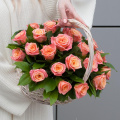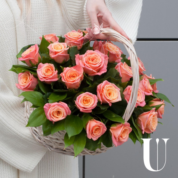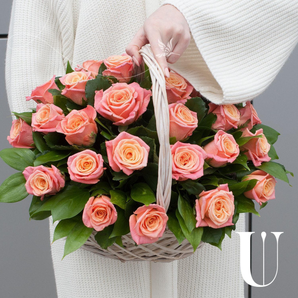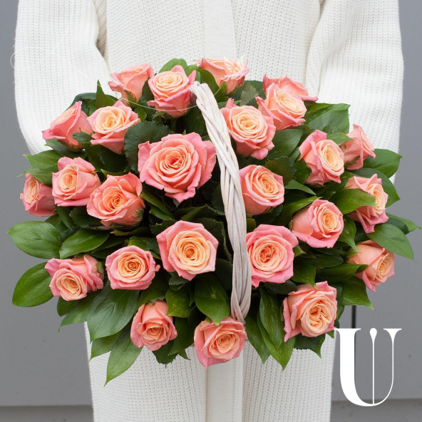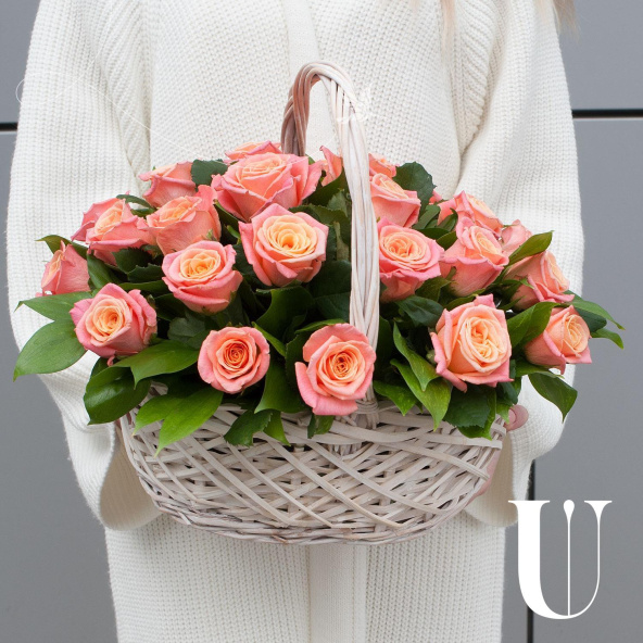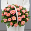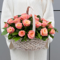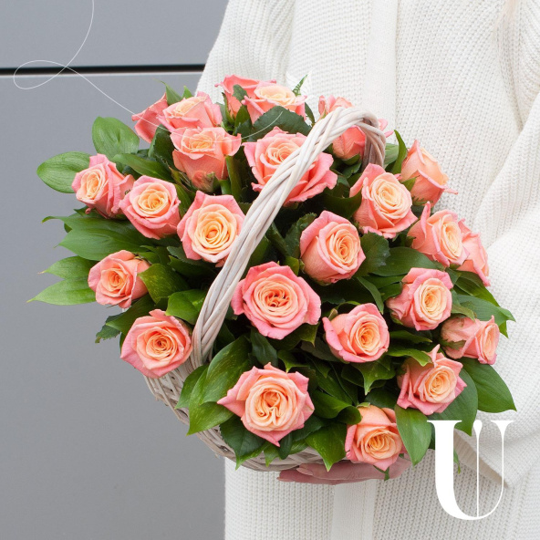 Композиция из розовых роз и кремовых кустовых роз в корзине