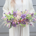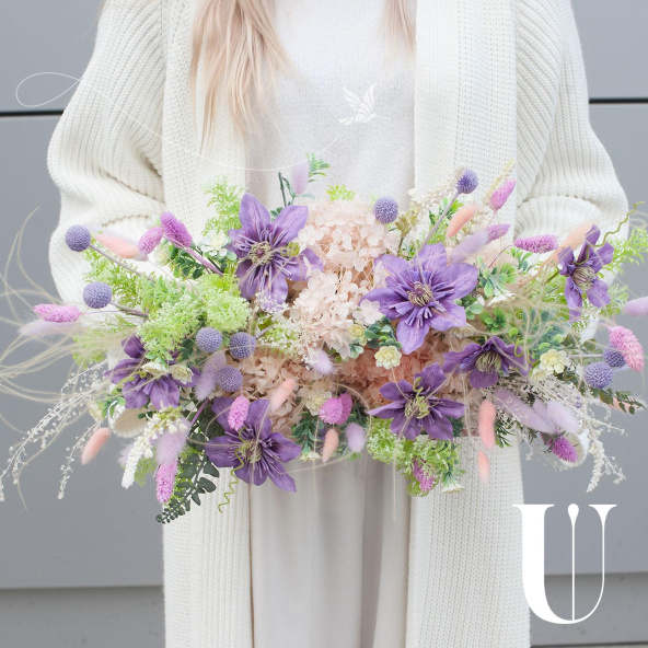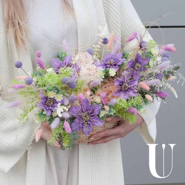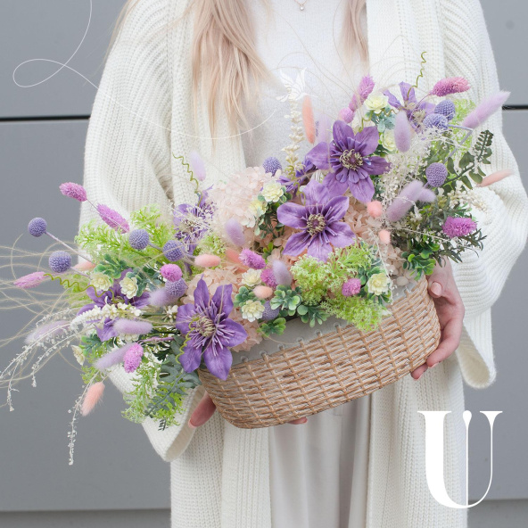 Композиция включает в себя различные виды сухоцветов, такие как гортензия, краспедия, лагурус, фалярис, гипсофила и озатамнус. Это позволяет создать яркий и насыщенный цветовой акцент в вашем интерьере.